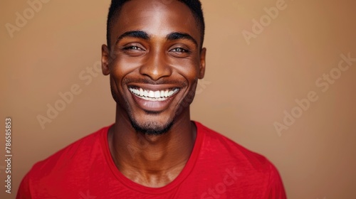 Cool happy man in red shirt smiling with white teeth against khaki background