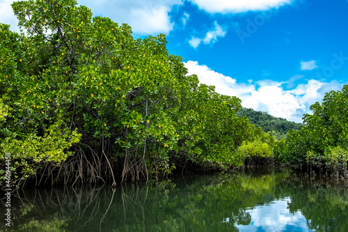 Cooper Creek, Daintree Rainforest in Queensland, Australia. Taken on the creek with view of mangroves and blue sky with some clouds reflecting on the water.