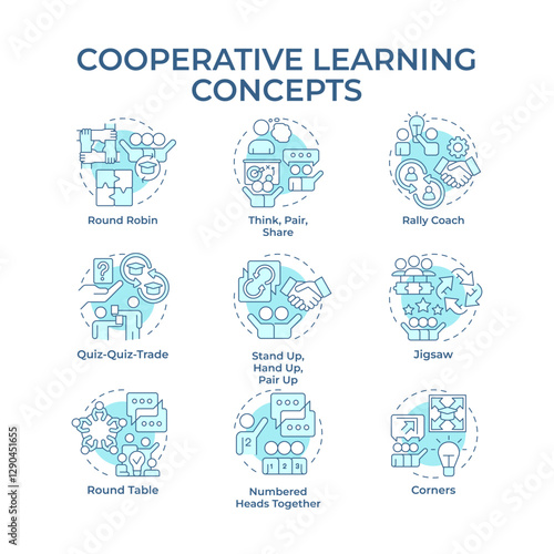 Cooperative learning soft blue concept icons. Teamwork, communication. Studying, education. Icon pack. Vector images. Round shape illustrations for infographic, presentation. Abstract idea