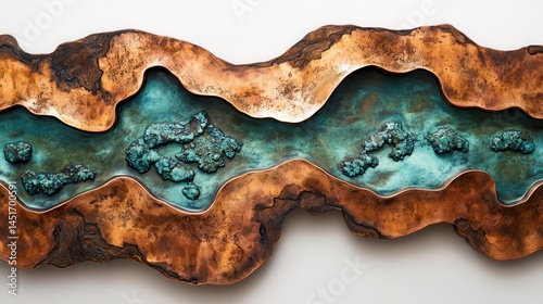 Copper and turquoise sculpture on a white background, top-down view. Use for backgrounds, textures, or any natural, artistic-themed designs.