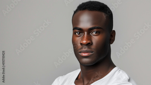 copy space, high resolution photo, 30 year very attractive black man, beautiful brown eyes he is very strong, defined jawline, wearing a simple T-shirt, he looks very confident.