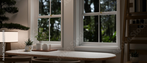 Copy space on a dining table by the window in a comfortable and minimalist room in the evening