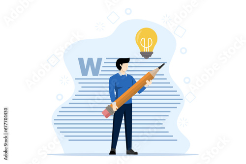 Copywriting concept, journalism, writing, copyright idea. successful man with pencil writing or editing text. Vector illustration in flat design on white background.Copywriting concept, journalism, wr