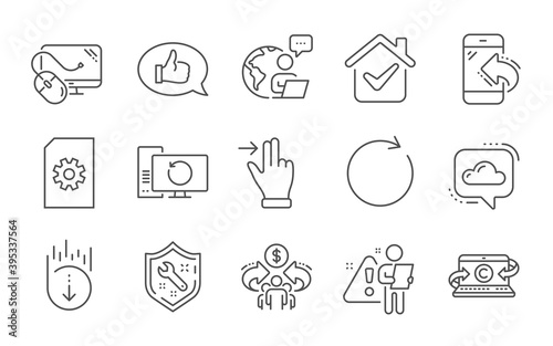 Copywriting notebook, Spanner and Touchscreen gesture line icons set. Sharing economy, Computer mouse and Synchronize signs. Feedback, File management and Scroll down symbols. Line icons set. Vector
