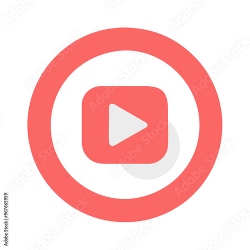 Coral play button icon in rounded square within a circular design representing media playback in modern flat style with copy space