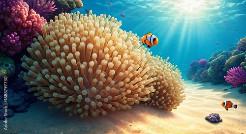 Coral Reef Ecosystem: Vibrant Underwater Scene with Clownfish and Anemones