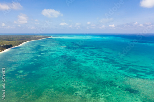 Coral reefs and atolls in the tropical sea, top view. Turquoise sea water and beautiful shallows. Philippine nature.