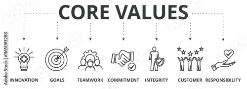 Core values banner vector illustration concept with icon of innovation, goals, teamwork, commitment, integrity, customers, and responsibility