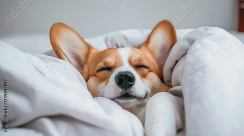 Corgi sleeping peacefully under soft blankets in a cozy indoor setting during the day