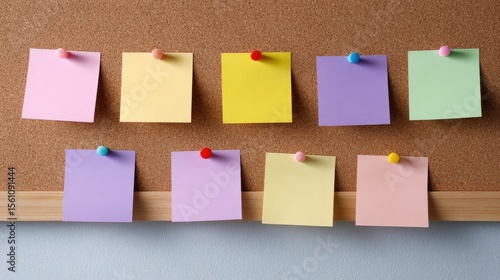 Corkboard with colored sticky notes and thumbtacks arranged neatly, empty side space for design