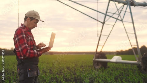 corn irrigation. a male farmer works on a laptop in a corn field. irrigation corn business concept. scientist studies growth and development lifestyle of agricultural plants using example of corn