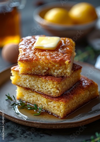 Cornbread - Moist cornbread slices with a pat of butter melting on top.