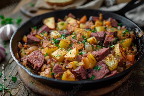 Corned beef hash cooked with vegetables in a cast iron pan