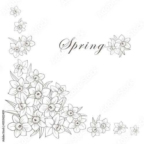 Corner frame of narcissus flowers isolated on white. Daffodils hand drawing line sketch, outline composition of many buds and leaves. Vector clipart for spring floral design, wedding or greeting card.