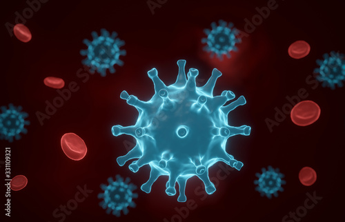 Coronavirus cell inside human body. COVID-19 cell in microscope view. Realistic 3D rendering. Virus simulation model in respiratory infections. Concept of healthy care.