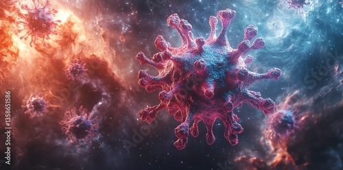 Coronavirus Cells Floating in Colorful Nebula Space Background
