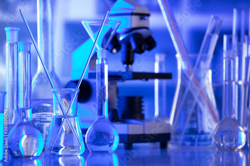 Coronavirus pandemic theme. Science research concerning fast covid tests and anti-covid vaccine. Beakers, microscope and test tubes on blue background.