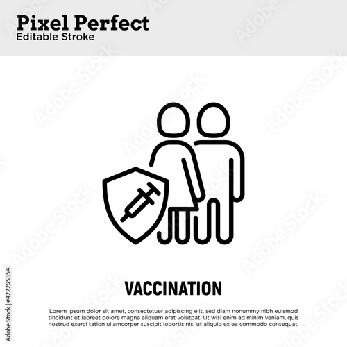 Coronavirus vaccination. Virus protection: family is protected by shield with vaccine. Immune system. Thin line icon. Pixel perfect, editable stroke. Vector illustration.