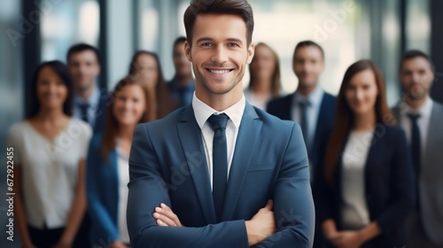 Corporate Confidence: Young Smiling Businessman with His Team in the Background. Generative ai
