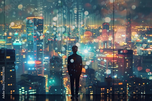 Corporate executive in formal attire enjoying the panoramic cityscape view from his office window