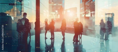 Corporate professionals collaborating in a modern office with cityscape background. Silhouettes of business people highlighted by soft daylight and long shadows, symbolizing teamwork and cooperation i