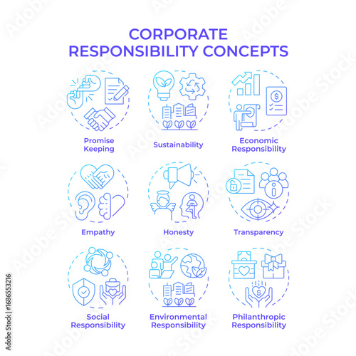 Corporate responsibility blue gradient concept icons. Business ethical commitment. Sustainable choices of company. Icon pack. Vector images. Round shape illustrations for article. Abstract idea