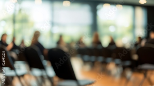 Corporate Seminar Blur: A blurred background of a corporate seminar or training session in a conference hall, with attendees.