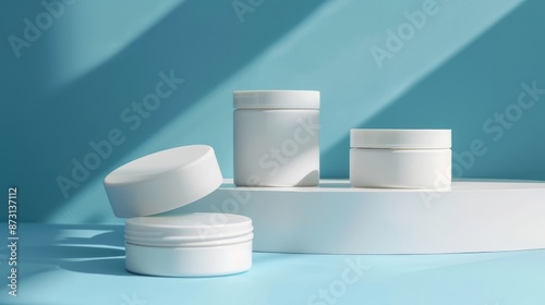 Cosmetic containers on blue backdrop with room for creativity