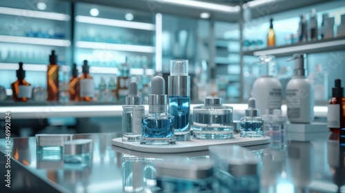 Cosmetic podium display featuring glass flask and cylinder equipment in a modern medical science lab background. 3D rendered, professional and clean
