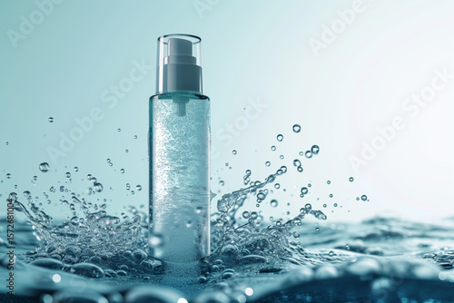 Cosmetic product bottle mockup, cosmetic container in water with air bubbles in soft blue tones, front view