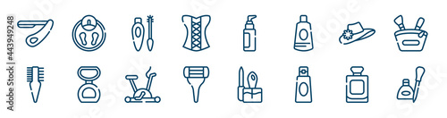 cosmetics icons set such as big scale, women corset, vintage woman hat, two side comb, null, french perfume bottle outline vector signs. symbol, logo illustration. linear style icons set. pixel