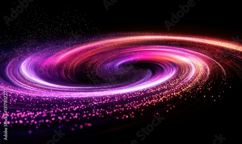 Cosmic abstract design with swirling purple and pink neon light, glowing particles creating a dynamic vortex effect