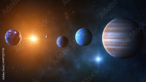 Cosmic Alignment: A breathtaking depiction of celestial bodies, planets arranged in a stunning celestial alignment, capturing the vastness and beauty of the cosmos.