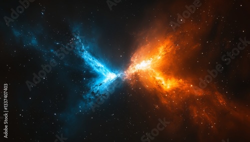 Cosmic clash of vibrant nebulae. Intense colors of hot gas clouds collide against a backdrop of dark space, scattered with distant stars