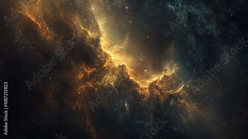 Cosmic cloud of gas and dust illuminated by starlight in deep space at night