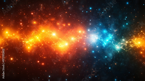 Cosmic Connection: A High-Energy Abstract Nebula of Vibrant Orange and Blue Galaxies Linked by Electric Light Trails in Deep Space