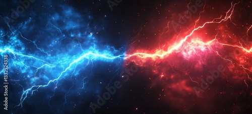 Cosmic Energy Clash A Dramatic Display of Blue and Red Lightning Interacting in the Vastness of Space