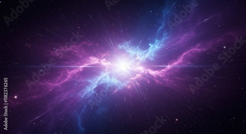 cosmic explosion, nebula, vibrant purple and blue colors, bright central star, energy burst, deep space, starry background, celestial phenomenon, ethereal glow, galactic clouds, dynamic light rays, as