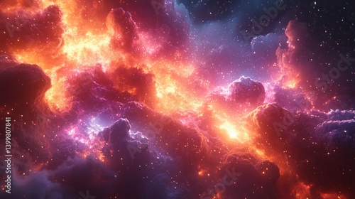 Cosmic fire nebula, swirling gas clouds, distant stars, space exploration backdrop
