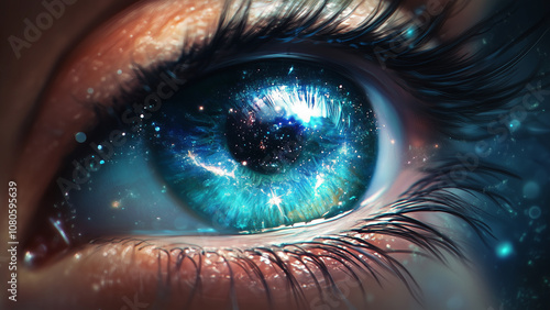 Cosmic Gaze: Shiny Eye Looking Up with a Galaxy-Inspired Iris