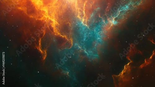 Cosmic Nebula, fiery orange and teal gas clouds, distant stars, space background, science fiction