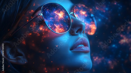 Cosmic nebula reflection in sunglasses of a stylish tourist