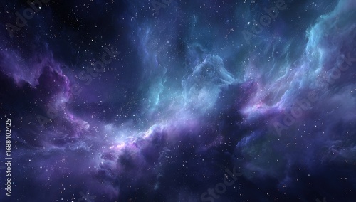 Cosmic nebula, swirling clouds of vibrant purple, blue, and pink nebulae against a star-studded dark background