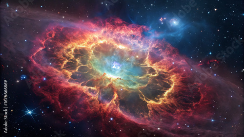 Cosmic Nebula: Vibrant Hues of Red, Orange, and Blue in Deep Space, Celestial Wonder, Starry Background.