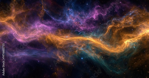 Cosmic nebulae, swirling hues of orange, pink, and teal, against a star-dusted backdrop. Detailed patterns and textures of gaseous clouds