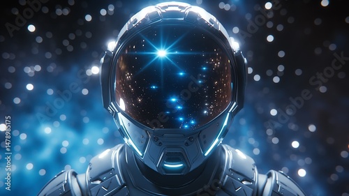 Cosmic nomad exploring the vastness of space with a shimmering helmet reflecting the starlit universe
