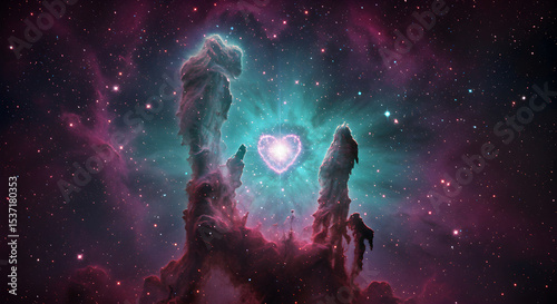 Cosmic Pillars Embrace Glowing Heart in a Nebula's Vibrant and Mysterious Realm