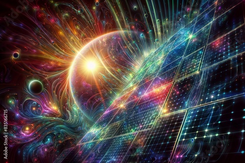 Cosmic scene with a radiant sun, Earth, celestial bodies, and a futuristic cityscape with vibrant colors and intricate patterns, creating a sense of movement and energy.
