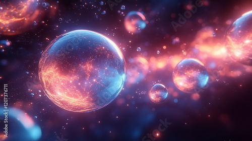 Cosmic spheres in glowing blue and orange light, surrounded by misty space and stardust.