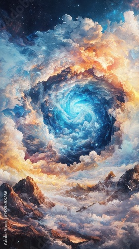 Cosmic spiral action in the sky cloudy landscape digital art serene environment panoramic view universe concept